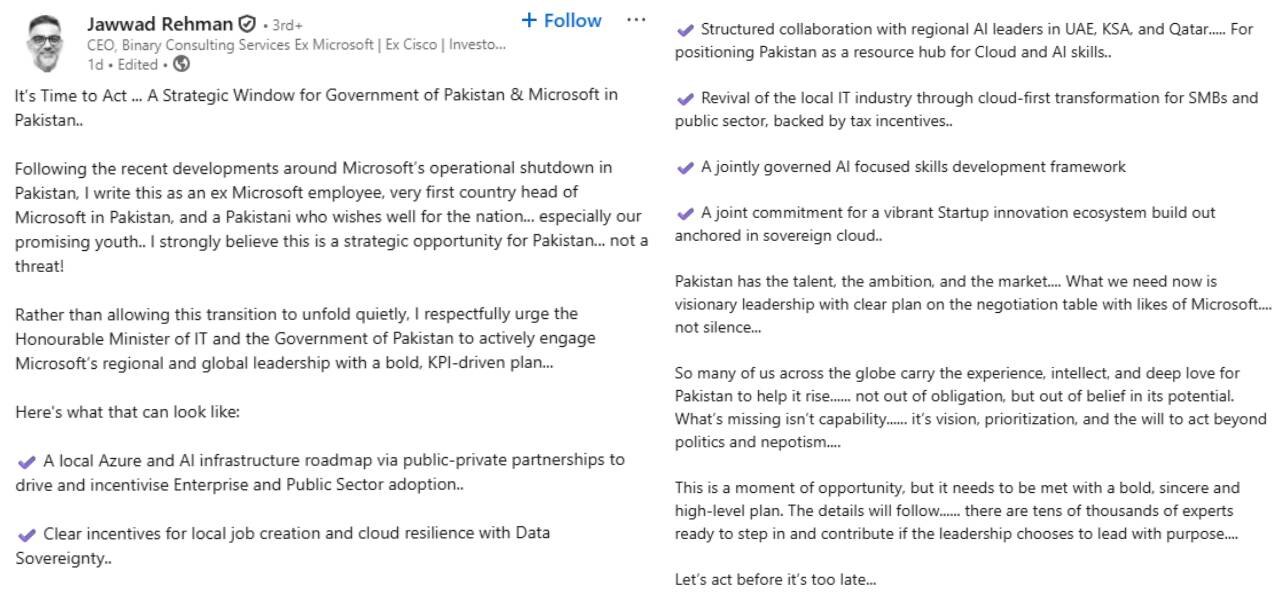 पूर्व माइक्रोसॉफ्ट पाकिस्तान प्रमुख जव्वाद रहमान ने एक स्पष्ट LinkedIn पोस्ट में सरकार से आग्रह किया कि वह वैश्विक टेक कंपनियों को बनाए रखने और आकर्षित करने के लिए KPI आधारित रणनीति अपनाए। उन्होंने लिखा, “जब माइक्रोसॉफ्ट जैसी वैश्विक कंपनियां भी टिक नहीं पा रहीं, तो यह सोचने का विषय है।”