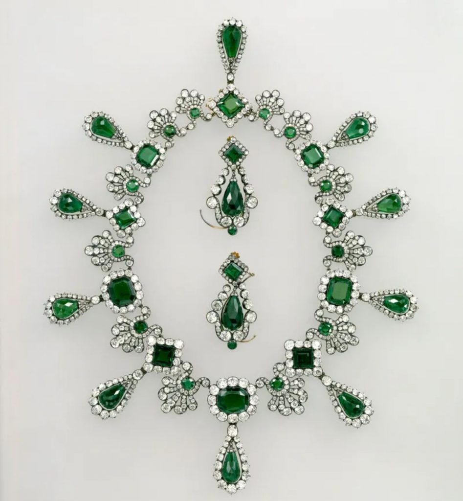 - महारानी मैरी लुईस का एक पन्ना हार और पन्ना की बालियों की एक जोड़ी।
